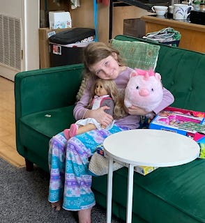 All in all it was a great day. Becky got an American girl doll as her big present. She’s been asking for one for two years. I was able to get it used on a Facebook group. I got Esther a used My Life doll so she could play with Becky with a similar sized doll since we couldn’t afford two used American Girl dolls. The AG doll was $50, and the ML doll was $20 at a local consignment shop called Once Upon a Child. The girls are thrilled and I also got Becky a doll pattern and some fabric to sew her a dress! And I think this will help teach basic pattern rules to her too as we sew.